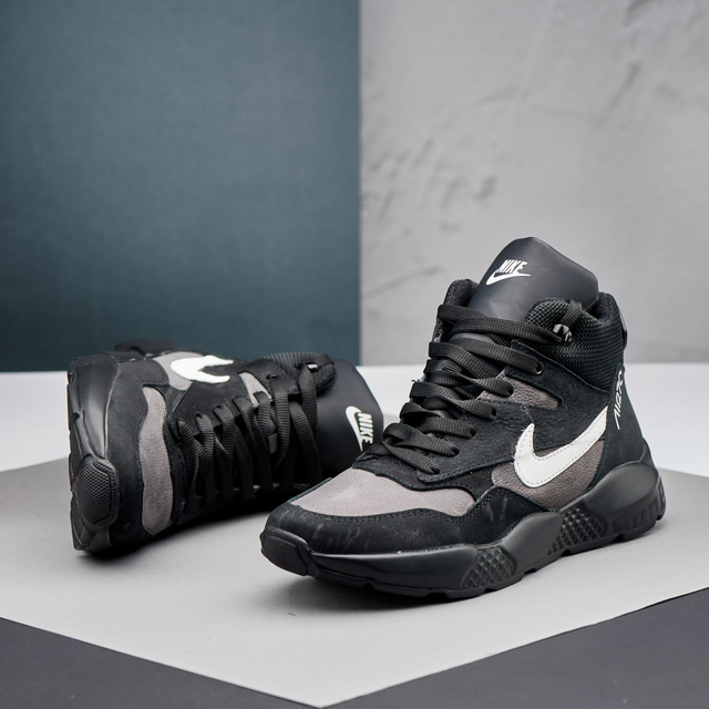 Чоловічі шкіряні зимові кросівки, черевики чорного кольору з сірими вставками утеплені, розміри повномірні: 40, 41, 42, 43, 44, 45